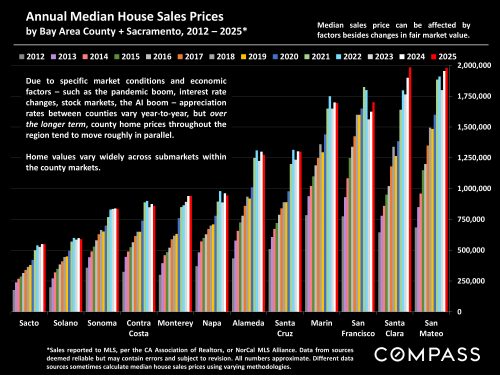 A year-over-year look at total 1st half sales for 11 greater Bay Area Counties. In Q1 2025, both dollar volume and unit sales volume increased from Q1 2024. Then in Q2, with the enormous economic volatility, dollar-volume and unit sales volume declined year over year, though not by huge percentages (down 2.5% in dollars, 3.4% in units). Overall, 1st half sales in 2025 increased about 2.4% by dollar volume sales. Note that, as always, trends varied by county.