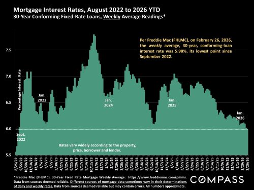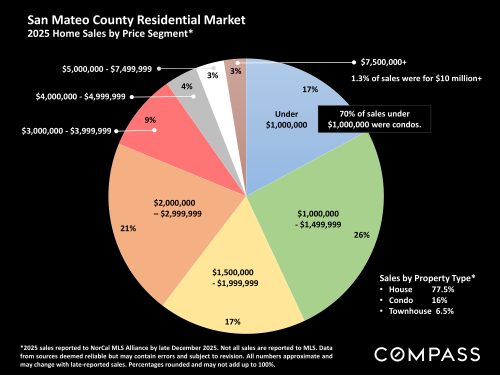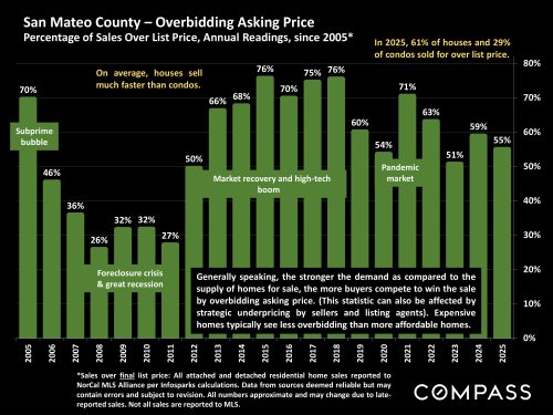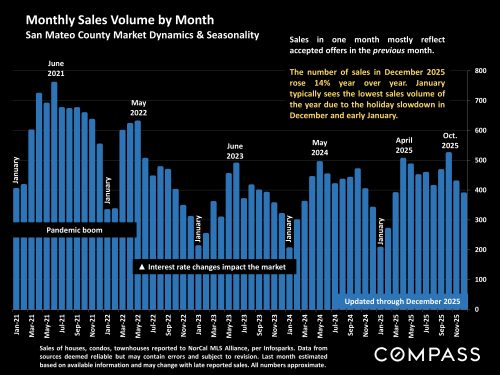 A broad overview comparing 30-year mortgage interest rates to Bay Area sales volume since 2016. Sales have been gradually increasing since bottoming out in 2023 – as interest rates have generally declined from their 2023 peak.