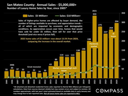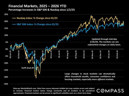 A broad overview comparing changes in the S&P 500 Index to Bay Area luxury home sales volume, since stock markets began their huge rebound in late 2023.