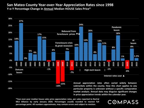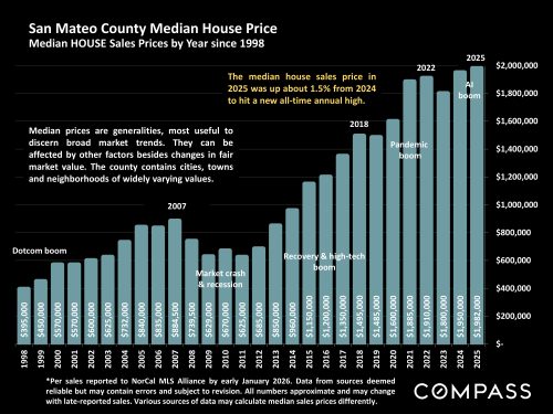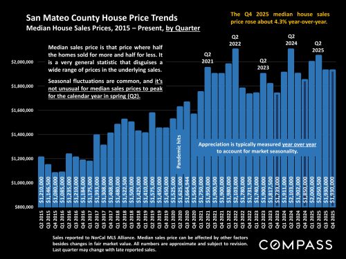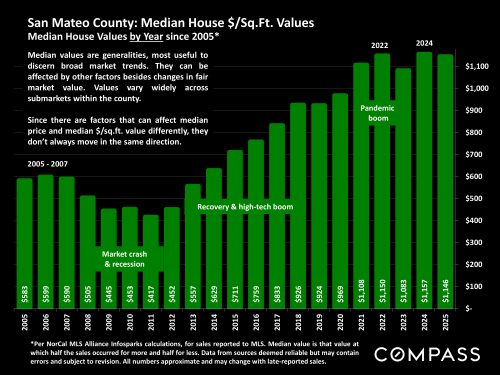 Comparing appreciation of Bay Area median sized houses (1500-2000 sq.ft.) to that of much larger houses (4000-6000 sq.ft.) over the past 2 years. Over this period, interest rates saw declines from 2023 highs, while stock markets saw spectacular gains – and larger houses appreciated at twice the rate of smaller houses.