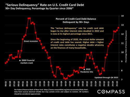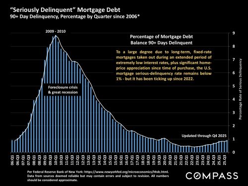Mortgage debt delinquency remains very low by long-term standards, as illustrated below, but delinquencies for the lowest-income bracket rose from 0.5% in 2021 to nearly 3% by the end of 2025, more than triple the overall rate.
