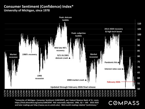 Consumer Sentiment, University of Michigan: “Consumer sentiment stagnated this month with very little change…About 46% of consumers spontaneously mentioned high prices eroding their personal finances…Sentiment is about 13% below a year ago and 21% below January 2025. That said, views vary considerably across the population. A sizable month-to-month increase in sentiment for the largest stockholders was fully offset by a decline among consumers without stock holdings. Similar divergences were seen across income and education, where higher-income or college educated consumers exhibited increases in sentiment while lower-income or less-educated counterparts did not. With their much stronger income prospects and investment porfolios, wealthier and higher-income consumers feel better insulated from any possible risks to the economy.”