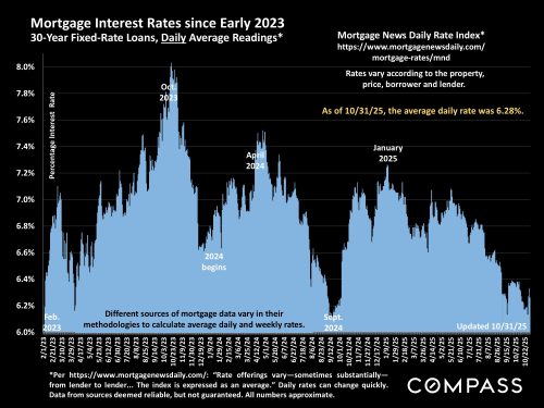 A broad overview comparing 30-year mortgage interest rates to Bay Area sales volume since 2016. Sales have been gradually increasing since bottoming out in 2023 – as interest rates have generally declined from their 2023 peak.